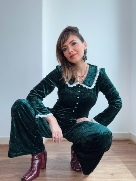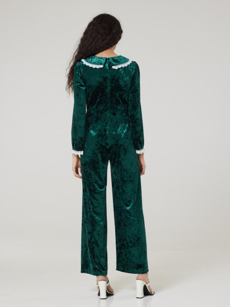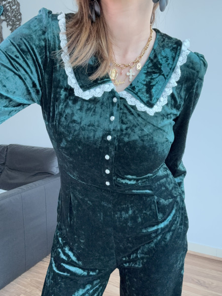 Le luxe ultime du confort. Cette combinaison en velours vert forêt se distingue par ses jambes larges qui créent une silhouette majestueuse. Sa matière douce et chatoyante capte la lumière, offrant une allure sophistiquée idéale pour les grandes occasions.