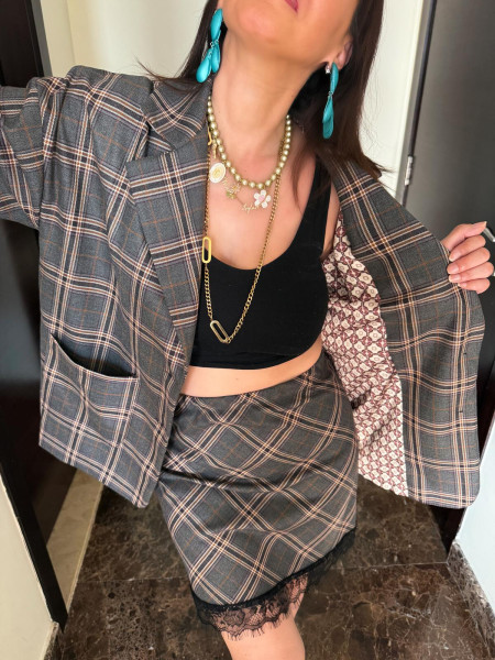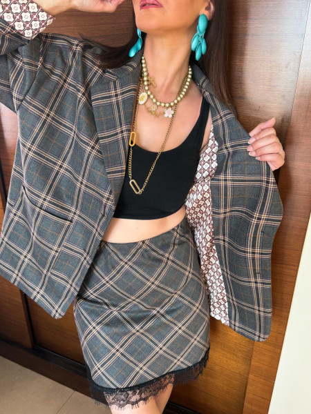 Cette tenue élégante se compose d’une jupe à carreaux au style à la fois classique et moderne. La jupe est dotée d’un élastique à la taille, offrant un confort optimal et un ajustement parfait. Sa coupe fluide met en valeur la silhouette tout en restant agréable à porter. En bas, une fine dentelle noire ajoute une touche raffinée et féminine, contrastant délicatement avec le motif à carreaux.