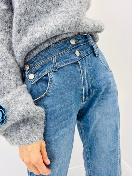 Jean coupe droite avec fente, il est court et il a une double ceinture. Des boutons et un zip de fermeture.