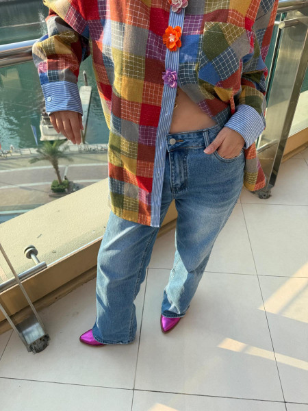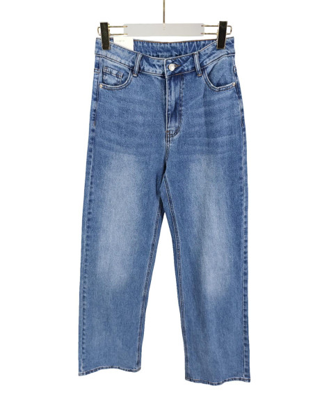 Jean coupe droite et légèrement large avec poches, zip et boutons.