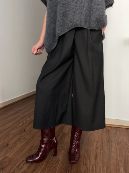 L'alternative parfaite au pantalon d'été. Ce Bermuda long noir se distingue par sa coupe porte-feuille élégante et structurée. Le style croisé assure un ajustement flatteur et un tombé fluide, lui donnant l'allure sophistiquée d'une jupe-culotte. Un essentiel chic qui allie le confort d'un short à la polyvalence du noir.