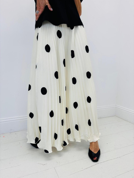 Jupe longue blanche à la coupe évasée et plissée, ornée de grands pois noirs contrastés. Taille haute élastiquée pour un confort optimal et un style rétro chic indémodable.